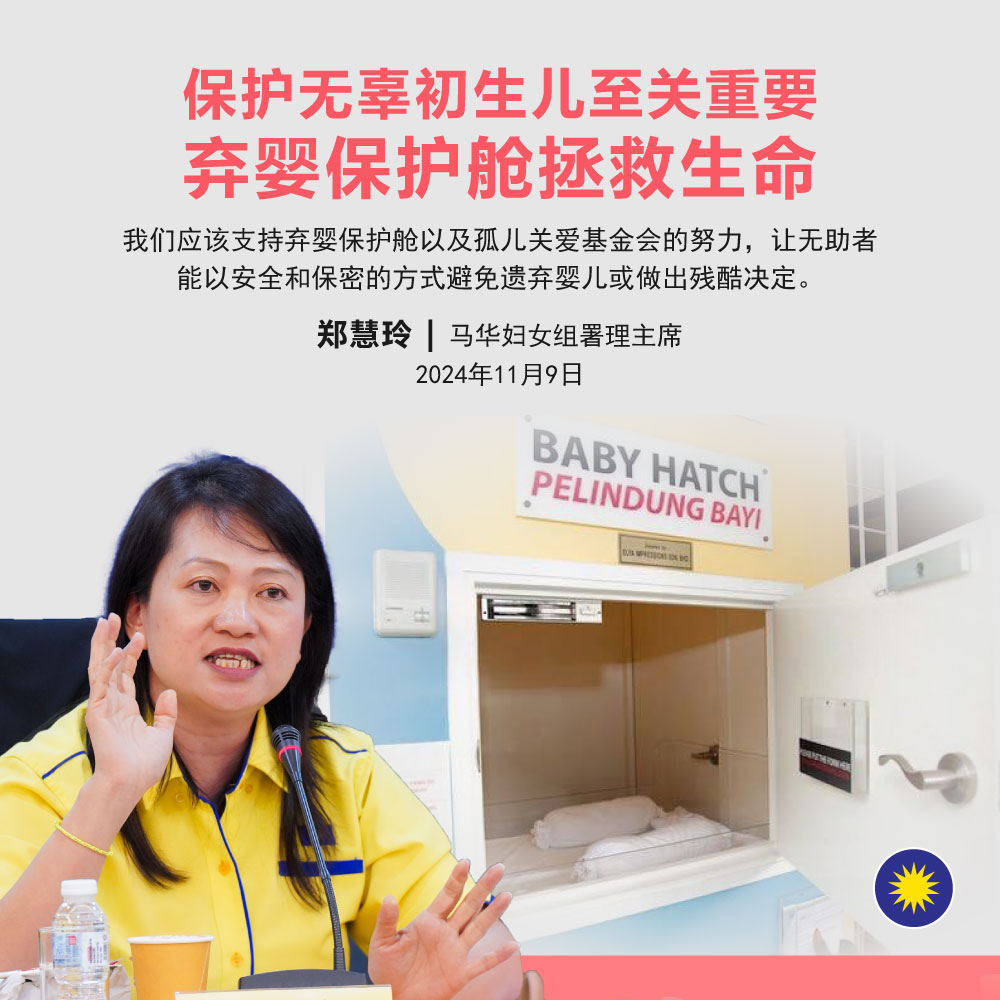 “马华妇女组赞同基金会的查卡丽雅所说,虽然该基金会挽救了生命,但拯救婴儿人数的增加也显示出弃婴问题日益严重。因此,我们应该支持弃婴保护舱以及孤儿关爱基金会的努力,让无助者能以安全和保密的方式避免遗弃婴儿或做出残酷决定。”